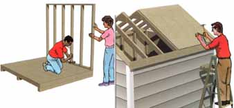 erect one in no time. PREPARE A FOUNDATION AND FLOOR: Most shed kits do not include floors; they can be purchased as an option, or it’s easy to build your own. A solid floor and foundation beneath a shed will prolong its life. There are two basic options for floors: a concrete slab or a plywood floor constructed on top of 4x4 treated timbers, which in turn rest on a gravel base. In either case, lay out the area with batter boards and mason’s lines. Remove the sod from the area, taking about 4 inches around the perimeter of the shed. If you’re going to pour a concrete slab floor, add a 3-inch sand base on the earth. If the shed is extremely large, check with local building codes for foundation and footing requirements. Pour the concrete into 2x4 forms so the top of the slab is 3 - 4 inches above ground level. You may have to place anchor bolts in the concrete for the shed walls, depending on the manufacturer’s instructions, For a plywood floor, excavate an additional 4 inches and place 4 inches of gravel on the earth. Set three or more (depending on the size of the shed) 4x4 pressure-treated timbers on the gravel, making sure they are level in all directions, Using pressure-treated 2x4s, build a floor frame on top of the timbers with joists spaced 16 - 24 inches on center, depending on the size of the shed. Nail / pressure-treated plywood on top of the floor frame.