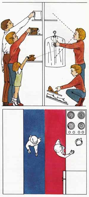 A Perspective on StorageStorage means more than just places to stow things. It’s a system composed of three interrelated elements: people—those who need to get to and use stored things; places—the space devoted to storage functions; and things—the items stored. The better these three elements fit together, the better your storage system will work. This guide is designed to help. Where Storage Problems Begin We all face storage problems. They arise from the structure of our homes and from the patterns of our lives. Most homes lack adequate storage facilities, possibly because storage space is rarely a priority when they’re designed. Even when a home contains good storage space, individual life-styles will make a difference in how fully it is utilized. For example, older homes may have a built-in storage and serving space in a dining area, appropriate to an era of formal dining. Today’s more casual lifestyle may well mean that such a unit is rarely used. Individual living patterns can be at cross-purposes to the fundamental structure of the dwelling, as well, which will aggravate storage problems. Furniture arrangements and habits of doing certain tasks in certain places may conflict with the natural traffic paths and activity areas of a home; such a conflict undermines even dogged attempts at improving storage—or anything else (traffic patterns and activity areas are discussed later). It is also a fact that, over the years, we tend to have more and more possessions. Households expand in the twinkling of an eye, but the size of living space doesn’t. Perhaps it’s a new baby—complete with diapers, highchair, and stroller. Perhaps it’s children who grow into and then out of everything—clothing, activities, toys—faster than seems possible. Or maybe your own changing interests bring a tide of new things into your life: board games, expanding libraries and record collections, or new hobby, cooking, and sports equipment. Somehow there are more things that we can’t live without, such as food processors, video equipment, televisions, tape cassette players, and hair dryers. In addition, there are the cherished mementoes of a lifetime, family heirlooms, and personal records—all of which have to be dealt with somehow. Getting Started on Solutions Your own storage situation will be unique. People differ; no two households are quite alike; even identical dwellings will be used quite differently by different people. The particular way in which you approach and resolve your own storage problems will be appropriate for you. There is no single rule or set of rules that will apply to every situation, but there are some basic approaches that can help you untangle even the tightest storage knots. One thing to keep in mind is that, although to have a storage system you need to be systematic—that is, to be logical and organized—you can make up your own system. Some people find it very sensible to store spices in alphabetical order; some do the same with their books. Perhaps alphabetical order doesn’t work for you, especially in your kitchen. That’s fine; but you’ll want to find some way to organize your books and spices that you will be comfortable with. You may want to group items by size or shape—all the frying pans on one shelf—or by frequency of use—the two frying pans you always use in a handy place, two others in a less-accessible spot. You may want everything of one kind together—all good coats, hats, and boots in the entryway closet, all rough or dirty outerwear hanging on hooks in the back hall—or you may want items used by particular individuals collected together—all adult coats, boots, and hats in the entryway, all kids’ things out back. None of these methods of organizing is necessarily best; what’s important is that there is a method. When part of the process of improving your storage situation is to settle on a method, then you have a framework to fall back on every time you look at an object and wonder where you’ll put it. If at some point the method seems to be losing its effectiveness, it may be time to reevaluate it and establish a new method. Keeping current is a key issue in any storage situation. We change over time, as do our interests and activities. We sometimes forget to change our living spaces to match our lives. Often a storage problem develops because we’ve outgrown some interest, but never quite gotten rid of its related equipment. For instance, in basements and garages all across the continent there repose outgrown skis and old wooden tennis racquets. Many homes have formal living rooms that amount to wasted space because entertaining takes place in the family room. Or a house may have a nice little sewing area that is no longer well-utilized space because other activities have replaced sewing. One way to start on storage improvements is just to review the pattern of daily 4e and see what changes have occurred. Finally, keep a sense of proportion about the subject. Your problems may be driving you to despair, and so them is important, but a rigidly organized, inflexibly ruled home won’t be a happy or satisfactory solution. At its heart, the aim of improving storage is to decrease the amount of attention it requires. If you can get the pedestrian aspects of daily life to chug cheerfully along as a self-sustaining support system, it will free you and those you share life with for more engaging activities. Storage begins with space; it can end with people—living in balance with one another and their surroundings. People and PlacesAs you think about changes and improvements in your storage system, you have an opportunity to arrange your living space so that it fully serves the people who use it. You and those who share your home come in different sizes and shapes, with different physical characteristics, strengths, and abilities. Standard building practices can’t take individual physical needs into detailed account; for