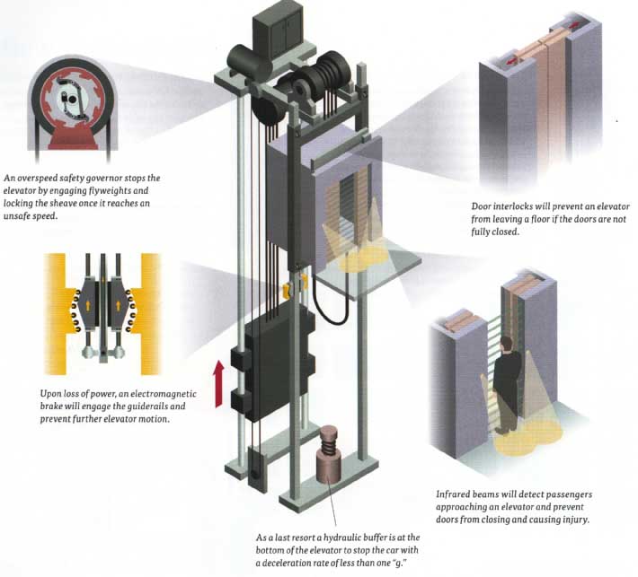 An overspeed safety governor stops the elevator by engaging flyweights and locking the sheave once it reaches an unsafe speed. Upon loss of power, an electromagnetic brake will engage the guiderails and prevent further elevator motion. As a last resort a hydraulic buffer is at the bottom of the elevator to stop the car with a deceleration rate of less than one “g”. Door interlocks will prevent an elevator from leaving a floor if the doors are not fully closed. Infrared beams will detect passengers approaching an elevator and prevent doors from closing and causing injury. Elevator Safety: As far as urban transportation goes, travel by elevator is far safer than traveling by train, car, or bus. The roughly two dozen deaths a year associated with elevators generally involve maintenance workers falling into an open shaft or getting entangled in elevator machinery. (A rare documented case of an elevator free fall occurred in 1945, when an Army B-25 bomber hit the Empire State Building in fog and its landing gear fell down an elevator shaft, snapping the elevator cables. The cab fell over 75 stories, but the elevator operator survived the fall: compressed air under the cab slowed its fall, and the severed cables, hanging from beneath the car, piled up in the pit and acted as a coiled spring.) Most skyscraper dwellers are wholly unaware of the numerous safety mechanisms designed into modern traction elevators. Foremost among these mechanisms is the governor, which senses the speed of travel and can automatically bring the machine to a stop by engaging a locking mechanism along the guiderail. It’s by no means the only braking mechanism: electromagnetic brakes, kept in an open position for travel, automatically engage when the car loses power for any reason. Likewise, an automatic braking system near the top and bottom of the shaft will be triggered if the car moves too far in either direction. Other safety features include sensors, which detect people or objects in the doorway and stop or reverse door closures; interlocks and door restraints, which prevent the elevator from leaving a landing if both sets of doors are not closed or from opening when it’s between floors; emergency lighting and telecom systems; and a buffer system at the base of the hoistway pit, which works like a cushion to soften any unlikely landing.