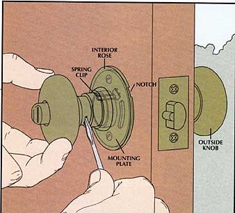 If screws secure the interior rose, remove them. If none are visible, use the tip of a screwdriver to depress the small metal tab projecting through a slot behind the knob. Pull the knob from the lock set, push in the spring clip that protrudes from the rose, and insert a screwdriver into the notch at the rim of the rose to pry the rose away. Remove the two screws in the mounting plate under the rose, and from the exterior side of the door, pull the outside knob, which contains the lock cylinder. With the door unlocked, remove the screws or nuts that secure the lock case (above, left). Wiggle the case off the door and the cylinder drive bar, then remove the screws of the rein forcing plate (above, right), and from outside the door, pull out the cylinder.