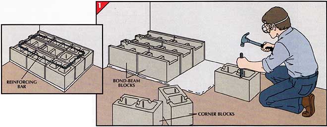 • Bend one end of several reinforcing bars 90 degrees and push the bars down through the cores of the outside blocks as far as possible. • Lay horizontal reinforcing bars in the channels around the edges of the top course of blocks (Step 1). • Fill the cores of all the blocks with mortar, then cover the cores with a course of concrete brick. Homemade Strong-rooms