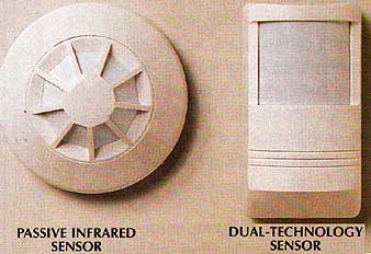 For a large interior space, passive infrared (PIR) devices usually provide better protection than photoelectric devices, which cover only a narrow area. PIR sensors—a ceiling model appears at near right—detect the presence of infrared energy, or heat. Remarkably sensitive, they are able to distinguish the difference between the amount of heat given off by a person and that emitted by a pet. More reliable are so-called dual-technology sensors like the wall-mounted model shown at far right. In addition to a heat-sensing PIR element, these devices contain a motion detector — a transmitter that sets up in a room a pattern of low-power microwave radiation, a type of radio signal. The slightest motion disturbs the pattern, alerting the sensor. If both heat and motion occur within a preprogrammed interval—usually a few seconds—the alarm sounds. PIR and dual-technology sensors, both available in wall- and ceiling-mounted models, look very much alike; read labels carefully when making your selection. Both require at least four-conductor cable; models with built-in tamper switches require six-conductor cable. All models come with reflective foil strips that you can stick inside the device to block the view of a heat source such as a furnace or space heater. Furthermore, you can position the sensors so that they ignore heat or motion in part of a room. The manuf’s installation instructions explain how to get the coverage you need.