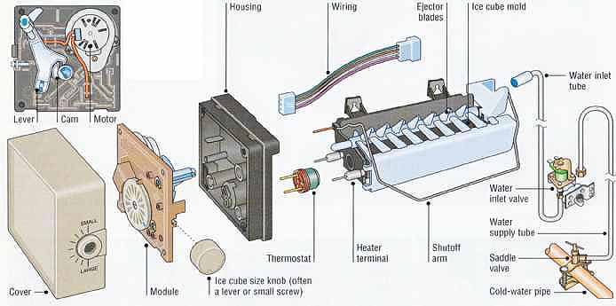 supply of ice cubes. The water flows through a tube to an inlet valve