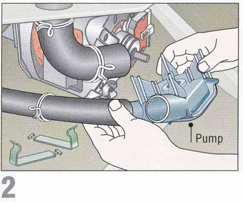 1. With a pan or towel underneath to catch water, pry open retaining clips with a screw driver and pull pump off motor shaft.