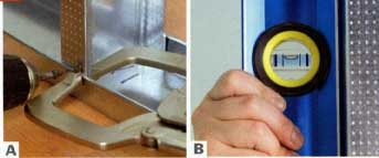 A. Clamp the metal studs to the tracks, making sure the stud is plumb,