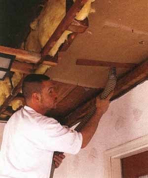 Insulating an enclosed-cavity floor with cellulose Any floor that is exposed to outdoor conditions or unconditioned space and has solid sheathing on the underside can be insulated with blown-in cellulose. Examples include garage ceilings, exposed heated porches, cantilevered overhangs, and sheathed floors built on piers. The process is the same as that of filling cavities in cathedral ceilings or walls. You must drill holes in each bay, then patch the holes when you are done. First, determine whether you will use a fill tube or a nozzle to fill the spaces. A fill tube requires fewer holes and does a better job, but it takes longer to install the material, and the tube may be difficult to find. You can also use a 2-in.-dia. nozzle, which requires many more holes if you are doing a large area. If the floor is already partially insulated with batts, a nozzle may be preferable, because a fill tube can easily get caught in fiberglass. Some contractors use 1-in.-dia. nozzles, but it’s impossible to get a truly dense application with a smaller nozzle. You will need a heavy-duty hole saw or rotary drill bit large enough to fit the fill tube or nozzle—generally 2 in. or 2½ in. Drill one hole between the joists in the middle of each floor bay Use a stud finder to locate the first joist bay, or drill a hole and probe the space with an insulated wire to find the nearest joist and the direction in which it runs. If you are using a fill tube, drill a line of holes, one in each bay, across the space. The row of holes should not end more than 2 ft. past the length of the fill tube (see the drawing), because the tube cannot blow material farther than 2 ft. If the length of each bay is much greater than twice the length of the fill tube, drill an additional row of holes farther down, so that you can reach the entire floor. You will also need extra rows if you find solid blocking between the joists. Blow in the insulation in the manner described for attic slopes. If you have a fill tube, push it in as far as it will go, turn on the machine, and keep pulling out the tube slowly as the material backs up. If you need to, hold a small piece of fiberglass over the hole so the dust doesn’t blow in your face (always wear a dust mask and safety glasses).When the end of the tube nears the hole, turn off the machine, push the tube into the joist space in the other direction, and repeat the process. When you are done with that hole, you should have a tightly packed fill that is difficult to push a finger through. If you are using a nozzle, drill a hole in each joist bay about 2 ft. from one wall. Fill each hole until the material backs up, then go on to the next hole. Drill another set of holes about 4 ft. from the first, then fill them; work your way across until you’ve filled the entire floor. When you are done, put a plywood plug in each hole so the surface is just shy of the drywall or sheathing material, and patch it with a good— quality instant patching compound or a non-shrinking wood filler. Prime and paint to match.
