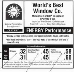 The Notional Fenestration Rating Council (NFRC) is a non profit, public/private organization created by the window, door, and skylight industry. The NFRC has established a voluntary national energy-performance rating and labeling system for fenestration products, which is typically the best way to compare true energy performance of windows. This label can be found on most new window products -- many states mandate NFRC listing for energy code compliance, and virtually all major manufacturers have their products rated. (The information on the label is typically also available in manufacturers’ catalogs; the NFRC product directory is also available online at www.nfrc.org). Note that the numerical values shown are for the entire window unit, including the glass, sash, and frame, and they make it easy to do energy calculations for any window of known dimensions. Residential size: Use this row for the “average” residential window. The exact sizes of Res and Non-Res vary by window type. Commercial size: Only use this row if you’re buying a really big window. The “U-factor” (U = I /R) represents conductive heat loss—smaller is better. Double Low-e windows typically range from 0.3 to 0.4; clear double glass is typically 0.5 to 0.55; and aluminum-frame, single-glazed windows can be over 1. Solar heat gain coefficient—SHGC— is the amount of direct solar radiant heat that gets in through the window. Lower SHGC reduces summer cooling loads, but higher SHGC increases solar heat gain in winter. Most windows fall between 0.3 and 0.6 on this 0-to-1 scale. Visible Transmittance—VT—is o measure of how much visible light gets through. Lower VT means reduced glare, but also less night time visibility. Most windows fall between 0.4 and 0.6 on this 0-to-1 scale.