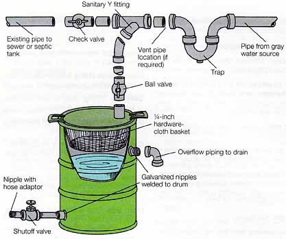 Precautions for using gray water Even the use of “clean” gray water raises safety concerns, the primary one stemming from gray water’s highly variable quality and possible contamination by bacteria, viruses, and para sites. Individuals can be infected by swallowing or inhaling those organisms. Though health officials have frowned on the use of gray water in the past, decreasing water supplies have caused some communities to al low its use for specific purposes. For the rules about gray water in your area, call your building, health, or water department. Still, be advised: Most building codes prohibit altering household plumbing to collect gray water without a permit. Minimizing health risks. The health risks from gray water are minimal if you collect and apply it properly. Never collect wash water contaminated by soiled diapers or by people with infectious diseases, or used in poultry or wild game preparation. Also, avoid collecting greasy, soapy water full of suspended solids. If you collect gray water, don’t wash strong chemicals down the sink. Such chemicals include products for opening clogged drains and products containing boron, chlorine, or sodium. Also, don’t collect water that has run through a water softener. Of the standard laundry soaps, liquid detergents have less sodium than powdered ones, and bio degradable ones are usually the least harmful. Most plants do well on gray water and will not be affected by mild soaps or shampoos. When using gray water, be sure to follow these basic precautions: • Always use gray water the same day it’s collected. • Don’t let it puddle or stand where it won’t be absorbed quickly. • Don’t spray or sprinkle it. • Wear rubber gloves whenever you handle gray water or equipment that comes in contact with it. Where to use gray water in the garden. You can use gray water to irrigate fruit trees, ornamental trees and plants, flowers and ornamental ground covers, and lawns. Do not use gray water to irrigate vegetables or fruits you intend to eat without peeling or cooking. Exceptions are crops such as corn, beans, and tomatoes, where the edible parts are well above the ground. Don’t use it for seedlings, container plants, or acid-loving and salt- sensitive plants. Collecting gray water A gray-water system installation usually involves connecting new pipes to the drainpipes of some plumbing fixtures, diverting the gray water through those pipes to a storage tank, where it’s filtered and stored for up to a day, and then distributing the water. If this type of collection is legal in your area, you’ll probably need a permit; washing machine plumbing may be excepted. Making drain connections. Cut into drainpipes (see Drawing 4) from sinks, bathtubs, showers, and the washing machine. (To collect water from main plumbing lines on showers and many bathtubs, the pipes must be accessible from a crawlspace or basement.) Install Y fittings and ball valves to divert water either to your gray water system or to the standard drain. Use ABS (acrylonitrile-butadiene-styrene) drainpipes to carry the gray water directly to the storage tank. Always provide for overflow into the sewer line in case the system backs up, and install a check valve between the tank and the sewer line to prevent sewage backup into the tank. Making a tank. Tanks can be made from metal drums, plastic or fiberglass drums made for food, or 35 to 55- gallon plastic trash cans (see Drawing 5). Ideally, the tank should be located above the landscaping to be watered so water can be distributed by gravity. To screen out hair and large particles in the gray water, make a shallow basket from 1 hardware cloth and hang it inside the tank just below the rim. Provide handles so you can lift it out frequently for cleaning. Lining the screen with a bit of straw makes it easier to clean. Near the bottom of the tank, in stall a shutoff valve and a fitting that will accept a ¾-inch garden hose. For a plastic drum, drill a hole and install a tank nipple, a shutoff valve, and then the ¾-inch hose fitting. For a metal drum, have a welding shop install a ¾-inch metal pipe nipple. Add a nipple for overflow piping near the top If the tank sits below grade or the garden slopes up above the outlet, install a sump pump. Add a check valve between the pump and the irrigation line to prevent backup. Remember, too, that no matter how well the water is filtered, storage tanks need periodic cleaning. Use a hose to flush the tank; then drain the tank by opening the shutoff valve. Distributing gray water Health officials believe that the safest way to apply gray water is below the soil surface or under 4 inches of mulch. Below-surface applications eliminate human contact, and the soil filters out any harmful organisms. To do this, you bury perforated pipe in a shallow trench filled with gravel. Buy 10-foot lengths of 3 or 4-inch rigid styrene drainpipe, with double rows of holes drilled along the length. Glue a 90° sweep fitting onto each end and add short lengths of pipe that will stick about 6 inches above the ground. Press a cap fitting onto each pipe (don’t glue the fittings). Shovel a few inches of 1 to 2- inch crushed rock into the trench, set the pipe in place, and level it. With the short pipe lengths pointing upward, bury the pipe beneath a few more inches of gravel; then top with soil. Put in one of these 10-foot-long systems wherever you intend to de liver gray water. When you’re ready to water, remove one cap, insert the hose that connects to the storage tank, and open the valve or turn on the pump. Simply move the hose from one system to the next to complete watering. Don’t try to connect a drip irrigation system to gray water distribution. Water for drip irrigation must be screened through fine filters that will clog frequently if gray water is used.