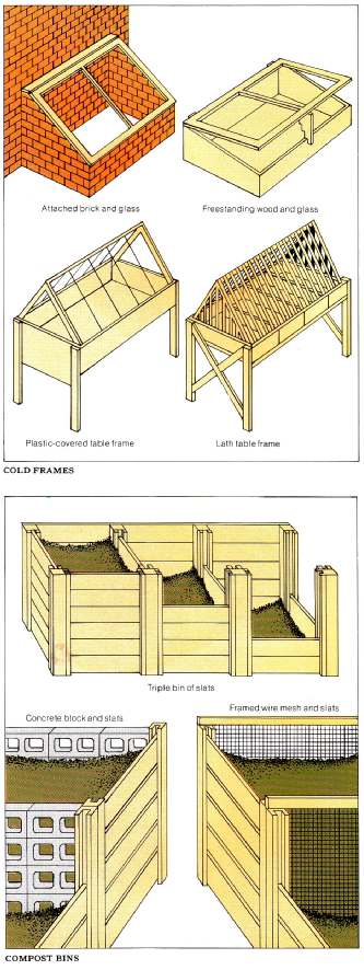 Bird lures Birds are welcome helpers in any garden, devouring large quantities of insect pests as well as seeds and suet. The sight and sound of birds chirping on a feeder ledge gives a garden special charm. The type of lure you build depends on the kinds of birds you want to attract. Some species of birds like small, single dwellings while others nest in colonies. Blue birds and wrens like a simple nesting box with a single round hole for an entrance; robins will nest on a sheltered shelf, purple martins prefer apartment complexes. The size of the entrance hole often determines the species attracted. Many other species prefer to build their own shelters. But all birds, no matter what the species, love baths. DESIGNS There are several kinds of bird feeders. The simplest is a platform feeder—a board mounted atop a pole and given a low rim to keep the seeds from falling off. The window shelf and tree box are variations of the platform feeder. Hopper feeders, mounted on a wall, tree or window sill, release seeds from a storage bin onto a platform below. Another type of feeder is a cage of large-mesh wire to hold Suet suspended from a tree branch. Among the most elaborate feeders is the terravium, a framed glass box that is set on a window ledge and extends inside the room. Among the simplest feeders are hollowed-put gourds and coconut shells. Weather-vane feeders pivot on posts so the seeds and the birds are sheltered from the weather. The simplest of birdhouses are boxes with open fronts or with removable or hinged tops. Roosting perches made of dowels should be placed inside; a perch outside the entrance may help enemy birds more than the occupants. Sheet-metal guards placed around the mounting tree or post, above and below the house, will keep cats and squirrels from the nest. Although all birds like baths, they won’t necessarily be attracted by all containers of water. A birdbath should be shallow with sides that slope gradually to a depth of no more than 2½ or 3 inches. Line the bottom with coarse sand or gravel; birds like a rough bottom where they can get a foothold. A simple birdbath can be made by inverting a plastic garbage-can lid atop a length of draintile; tie a weight to the handle of the lid to hold it in place. MATERIALS Scrap lumber, plywood, branches, wire screening and glass are common birdhouse and feeder materials. Metal should be avoided because it gets too hot. Naturally rot-resistant wood or wood that has been pressure-treated to prevent rot can be stained or left unfinished so it will weather to an unobtrusive color. Concrete and concrete-and-stone combi nations are commonly used for permanent birdbaths, but high-fired clay is also suitable. Clay or concrete baths may crack if water freezes in them. BRICK PATTERNS See Terraces and Patios, Walks, Walls Cold frames and hotbeds Like miniature greenhouses, cold frames and hotbeds are used for starting seedlings, cuttings or bulbs several weeks ahead of the outdoor planting season. A cold frame is heated only by the sun; a hotbed is also heated by an insulated electric cable placed under the soil. Otherwise the structures are identical. Hotbeds can be used earlier in the growing season and in colder climates. DESIGNS Cold frames and hotbeds are rectangular frames with transparent covers. In cold climates, both structures are set 3 to 4 inches into the ground for extra insulation. A 3-by-6-foot frame will hold four standard seed flats plus a few extra pots. A larger structure with compartments and a divided cover allows you to work in one section at a time without exposing the entire bed. The back of a cold frame or hotbed faces north and is higher than the front. The sides slope about an inch per foot so the winter sun reaches all plants and rain or melting snow will run off. A layer of sand or gravel within the frame speeds drainage. As the weather warms, the cover is propped up during the day to let excess heat escape. If a cold frame or hotbed is used only a few months of the year, it can be built with hinged sides and tops; use hinges with removable pins in the center so the structure can be disassembled for storage. In mild climates a cold frame can be mounted on legs to make it more convenient to use; in summer laths can be added to provide shade. MATERIALS An all-season, all-purpose cold frame or hotbed can be built with a framework of concrete blocks, bricks or a rot-resistant wood like redwood. A glass cover admits maximum light; old storm windows are often used. Glass is easily broken, however. Plastic reinforced with wire is less expensive than glass but clouds with age. A polyethylene sheet tacked to a frame of 1-by-2s makes a tough cover inexpensive enough to be replaced each year. Panels of corrugated or flat rigid plastic are long lasting but expensive.
