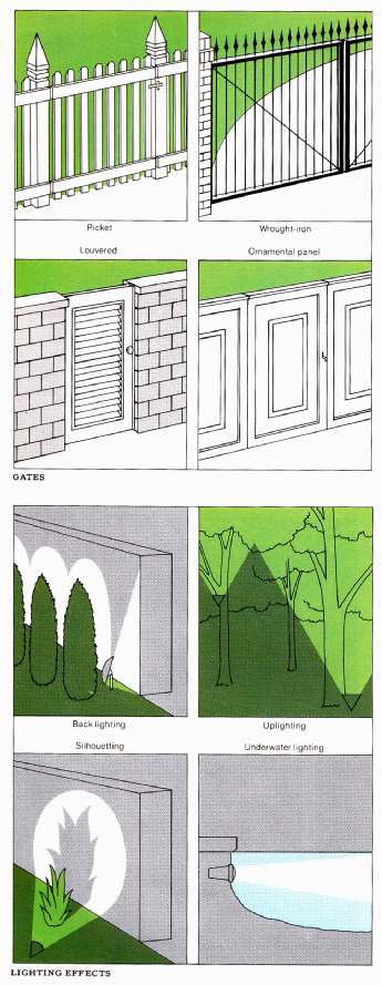 above: GATES; LIGHTING EFFECTS MATERIALS A gate similar in materials and design to its fence will blend in with it, while one made of contrasting materials will stand out and may seem more inviting. Wooden gateposts should be 4 by 4 inches for gates up to 5 feet high, 6 by 6 inches for taller gates. Any lumber that is used in gate construction needs protection against rot. Simple wooden latches can be made in your workshop; a wide assortment of metal latches ranging from hooks and hasps to locks with sliding bolts are available at hardware stores. GAZEBOS See Overhead Structures HANGING BASKETS See Planters HOTBEDS See Cold Frames and Hotbeds LATH HOUSE See Overhead Structures, Storage Lighting By illuminating trees, shrubs, plant beds, walks, steps and terraces, outdoor lights extend the enjoyment of a garden into the evening hours. When skillfully placed, they can have a dramatic effect. DESIGNS A well-designed lighting system places emphasis on the effects that are produced by the lights, not on the lights them selves. A variety of effects can be produced by aiming the light sources in different directions. A light placed behind a tree and aimed upward will silhouette the tree; a light that is positioned in front and aimed upward will cast a shadow pattern on a wall behind it. Downlighting can call attention to a single plant or produce a soft, diffused effect over a broad area. Downlighting is also the best for illuminating steps and walks to ensure safety. To make the garden seem as large as possible (and to draw insects away), place some lights at the perimeter. For an area such as a terrace where bright light is only occasionally required, a waterproof dimmer switch is desirable. Water proof submersible light fixtures are also available for use in pools and fountains. MATERIALS Two systems are available for garden lighting. One uses the standard 120-volt house current; the other, a low-voltage system, employs a transformer to reduce the current to only 12 volts. A high-voltage system produces brilliant light but its installation outdoors is complicated and can be hazardous. Low-voltage lighting is safe; the fixtures are small, light weight and easily concealed in the garden; the cost of operating the system is low. The simplest kind of low-voltage transformer plugs into any outdoor receptacle. The amount of current that a transformer emits, usually between 72 and 330 watts, determines the number of fixtures and the length of wire that can be used. Transformers of 126 watts are adequate for most gar dens. This system can be turned off by pulling the plug, but it’s more convenient to have the outdoor receptacle con trolled by an indoor switch. Some low-voltage systems are controlled by photoelectric cells, so the lights automatically go on at dusk and off at sunrise. The cables of both the 12-volt and 120-volt systems are buried, but your building code will probably require that 120-volt cable be sheathed in waterproof metal conduit or heavy plastic, and be buried at least 18 inches deep. The cables used for low-voltage systems need be buried only deep enough to keep them from being accidentally cut. In either case, garden lights can be positioned anywhere you want them if you use branching cables to supply power; the objective is to have effective light sources but make the fixtures unobtrusive. If a low-voltage fixture is mounted in a tree, the cord is just stapled loosely to the trunk where it’s least likely to be seen. Low-voltage fixtures set in plant beds should have an extra foot or so of wire buried next to them, so they can be moved without rearranging the whole system.