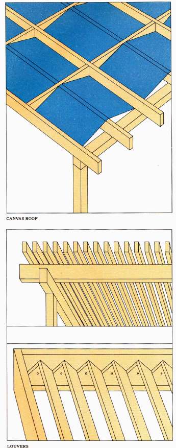 above: LOUVERS; CANVAS ROOF FRAMEWORK Most overhead garden structures have frameworks of posts, beams and rafters. The framework for a roof that covers a terrace is attached on one side to a board called a ledger, which in turn is attached to the house; the other sides of the framework are supported by posts. A freestanding structure is supported only by posts. The weight of the roof often determines the materials used in the frame; a lace-on canvas roof can be supported by light 3 pipe; a heavy wood grid requires strong 4-by-4 wood posts or steel supports. Preservative-treated wood posts can be sunk directly in the ground where building codes and a mild climate permit. In northern areas, where frost heaving is a problem, such posts should be set in concrete for stability. Posts 11 feet long can have 8 feet above ground to give comfortable head room and 3 feet below ground. When the posts are set, the beams are attached to them with metal T braces, then the rafters are nailed to the beams. A closed roof should slant at least ¼ inch per foot so rain and melted snow will run off. The structure must be strong enough to support your weight as you build or repair it. ROOF MATERIALS The overhead frame can be covered with a variety of materials, including wood, reed, bamboo, wire screening, canvas, plastic shade cloth or panels of plastic, fiberglass or aluminum. Select a covering that suits the house design, meets the shade requirements of plants below and is easily maintained. Wood offers the widest range of roof possibilities. A simple but elegant overhead can be made from short pieces of lumber set between rafters in an open eggcrate pattern. Lath or batten strips, in crisscross patterns, will support climbing plants and increase the strength of the structure. Heavier pieces of lumber can be slanted as louvers, either fixed in place or bolted with wing nuts to make them adjustable. Treat wood structures with a preservative and be prepared to renew paint or stain every few years. Woven reed or bamboo shades make an inexpensive cover for an overhead structure. They can be left free to be rolled up or down to provide varying amounts of shade and can be taken down for the winter. As a terrace roof, canvas blocks so much light that few plants will thrive under it. Panels of plastic, flat or corrugated, come in many shades and tints of colors that permit you to select the amount of light transmit ted. Plastic can be left in place year round but tiny surface scratches will trap dirt and reduce light transmission. PATHS See Walks PATIOS See Terraces and Patios PERGOLAS See Overhead Structures Planters Placed in front of a window, a planter seems to bring the outside in. A round planter backed by a low wall accentuates the natural curves of a garden. A hanging planter adds vertical dimension. Additionally, by raising plants off the ground, planters usually make weeding and transplanting easier and deter many garden pests. ![]()