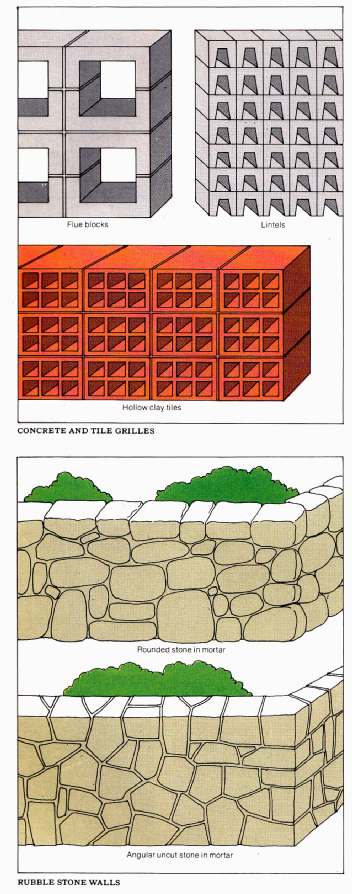 Lintels; Hollow clay tiles; CONCRETE AND TILE GRILLES; PREFABRICATED CONCRETE SCREEN BLOCKS; RUBBLE STONE WALLS; ASHLAR STONE WALLS Building a solid, safe retaining wall that won’t overturn or slide forward, especially during rainy weather, is no easy task. A low retaining wall (3 feet or less) that won’t be under great stress can be built by an amateur. For a taller structure, it’s advisable to seek the help of a professional. The most important consideration in constructing a retaining wall is to provide for adequate drainage, either through or around the wall. Ditches, gutters, weep holes and drain-tiles must be incorporated into the design. When retaining walls are expected to hold back substantial amounts of heavy, wet soil, special anchors called “dead men” are installed so they extend into the soil behind the wall. The first step in building a brick or block wall is to lay out the wall line with stakes and string. Then dig a foundation trench twice as wide as the wall width. If you are using footings of poured concrete, prepare the wood forms first, then pour and level the concrete, insert vertical reinforcing rods and let the concrete set. Before beginning actual construction, lay out a test course (one layer of bricks or blocks) on the foundation to check fit and alignment. Remove this course and lightly spray the foundation and the bricks or blocks with a garden hose. Secure the first course with mortar and check to be sure it’s level. Build up the corners first, stepping them down toward the center. Attach a guide line to keep the courses straight and level and check for plumb every three or four courses. Use a mortar that is carefully made, with ingredients measured accurately and mixed thoroughly. Put down a small amount of mortar at a time, covering the abutting surfaces of bricks, stones or blocks. Tap each piece level with a trowel handle and check with a taut string. Scrape off excess mortar. Space around vertical reinforcing rods should be mortared at each level. If work on the wall must be interrupted, cover completed work with a tarpaulin or plastic sheet. As the wall is constructed, you may want to attach gate fittings. (Hinge bolts can be set right in the mortar joints as you are building the wall; the bolts will be anchored more firmly than if they were sunk into pilot holes made after the mortar has hardened.) Attach the top course and smooth the joints along the face of the wall to a desired shape. Wet down the completed wall and keep it moist for several days until the mortar has cured. Then clean off mortar stains and drippings with a solution of 1 part muriatic acid to 9 parts water; wear rubber gloves while applying the solution with a stiff-bristled brush. Casting a concrete wall is similar to casting a footing. In both cases, the forms should be thoroughly coated with oil so they can be easily removed when the concrete has hardened.