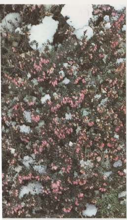 Pink clusters of King George heath and the pale flowers of Springwood White heath perk up a snowy landscape. Bright hues for gray days: Heathers and heaths (or Calluna and Erica, to give their generic names) are strikingly effective when interspersed in mass plantings of irregular shapes, so that their different foliage, flowers and heights create billowing mounds of varied colors and ragged outlines. The plants will do best in partial shade, sheltered from icy winds. They should be deeply planted in the early spring, in moist but not wet soil, and watered several times weekly until their roots have taken firm hold. Early in spring, all winter-damaged wood should be trimmed away. Heathers and heaths lend them selves well to casual gardens that have winding paths along which winter wanderers can stroll to enjoy these bright shrubs on a leaden gray day.