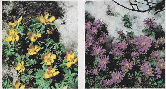 (l) The round cups of winter aconites pop out of the ground by mid-March in bitter-cold climates; (r) Looking like purple-dyed daisies, Greek anemones unfold their petals under the first rays of the March sun.