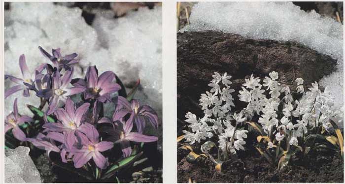 Star-shaped Siberian squills, which bloom in March, are notably prolific, spreading with each passing year. With broader petals than its violet counterpart above, the yellow Danford iris may bloom in late February. COLORFUL RELATIVES The heaths are closely related to the heathers, but the two plants are quite different in appearance and behavior. Heaths have needle-like leaves and bloom in winter and early spring; heathers have scalelike leaves and flower in summer — although the winter foliage of some varieties is so spectacular that it too is an important source of winter color. When hit by frost, a hillside of heather becomes a kaleidoscope of reds, yellows, purples, bronzes, oranges, browns, pinks and olive green. Indeed, a gardener must exercise restraint to avoid gaudiness. Furthermore, as you walk around a clump of heather it changes hue, for its colors characteristically develop most vividly on the side facing the sun. Heather seen as orange from one point may be green when viewed from another side. Heaths and heathers like sandy, acid soil and the cool, moist conditions of their natural environment. They are hard to grow in dry parts of the United States and in the warm, humid Southeast, where they live for only four or five years. They also need sunlight but at the same time protection from winter sun and wind, a condition that can usually be met with an eastern exposure and by interspersing them with other shrubs. A heavy mulch is often necessary to keep the roots from drying out. Otherwise, they are relatively trouble-free, needing only annual pruning — in late winter or very early spring for heathers and just after flowering for winter- blooming heaths — to keep the plants from looking scraggly. = = = = HEATHS VERSUS HEATHERS