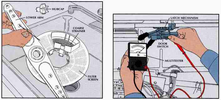 .. The most common complaints about dishwashers—they leak, don’t drain, or don’t clean well—often arise from clogs or mechanical breakdowns that are easily fixed, and in some cases the dishwasher may not be at fault. Hot Water Helps to Clean: Dirty or spotted dishes, for example, may simply be the result of insufficiently hot water. To check your water sup ply, place a candy thermometer or meat thermometer in a coffee mug, then turn the kitchen tap to its hottest setting and run water into the mug for 2 minutes. If the temperature is below 120°, raise the setting on your water heater to 120°. Fixing Those Leaks: Inspect the gaskets around the door, and check hose connections at the water inlet valve, pump, and drain valve. Reseat a slipped gasket in its track, and tighten or replace any loose hose clamps. Replace hoses that look as if they are cracked or brittle. More serious are problems involving the pump, motor, or timer, as these three parts are the hardest to fix. Only disassembling and cleaning the pump is shown—in all other cases you should call for service. CAUTION---Before attempting any repair of a dishwasher, turn off the power to the machine at the house service panel. TOOLS: