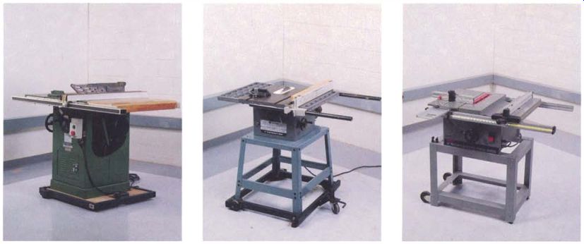 Table-Saw Types Table saws fall into three general categories: cabinet saws, contractor's saws, and bench top machines. Except for the location of the motor and general heft of the machine, cabinet saws and contractor's saws are very similar in design. Modern benchtop saws, which use compact motors and aluminum castings, are distinctly different. Cabinet saws are the heaviest and most powerful of the group. They have an enclosed steel base, which gives them their name, a cast-iron table, and motors of 2 hp to 5 hp. Smooth running and powerful, cabinet saws have been around since the 1930s and are essential equipment in most professional shops. Typically supplied with cast-iron extensions (also called wings), they are often supplemented with laminate-covered extension tables, which make the saws more convenient and safer to use. Because the running gear is mounted on a single, large casting, cabinet saws tend to be stable and therefore very accurate. The extra stability also means saw parts are not as likely to rattle out of alignment. From a maintenance point of view, cabinet saws have an essential advantage: The motor and arbor assembly is attached to the base cabinet rather than to the top (see the bottom photo on p. 53). This makes it easy to align the miter gauge slot with the blade. An enclosed base also improves dust collection. Contractor's saws were designed so carpenters could take them to the job site. Weight-saving design compromises, however, reduce the saw's accuracy and increase vibration. Cast- iron components are lighter than those on cabinet saws, and they are not made from a single casting. Contractor's saws come with either cast-iron or stamped-steel table extensions, although extensions on some older saws were open cast- iron grids. Motors on contractor's saws are suspended from a bracket at the back of the machine, allowing it to be removed for transportation (see the photo at left on the facing page).