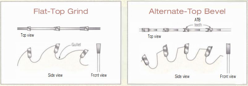 ----------- Alternate-Top Bevel You WILL GET THE BEST RESULTS FROM YOUR TABLE SAW by choosing the correct blade for the job you're doing. The four types are rip blades, crosscut blades, combination blades, and triple-chip blades. Rip blades, which are designed to cut with the grain, have a flat-top tooth profile, called a flat-top grind (FTG). Each tooth takes a long, plane-like shaving, while the blade's deep gullets clear debris quickly. There are typically no more than 24 teeth on a 10-in. blade. Rip blades are especially good on stock thicker than 1X in. and on tough wood such as oak and tropical hardwoods. Rip blades are a necessity for cutting green wood and some softwoods because the stringy shavings clog up the smaller gullets of combination blades. A crosscut blade has a different tooth shape. The profile comes to a sharp point that cleanly slices the wood fiber. Teeth are beveled across their width. Since the blade needs to cut along both edges, the bevels reverse their slope from tooth to tooth, hence the name alternate-top bevel (ATB) . Sixty teeth on a 10-in. blade is common. Crosscut blades do well at cutting MDF and plywood but may cause some chipping of veneers and melamine facings. A combination blade is exactly that, a mix of alternate-top bevel teeth and flat-topped teeth called rakers. The typical ratio is four ATB teeth followed by a flat-topped raker with a deeper gullet. The tooth count falls in the mid range, 30 to 40 teeth in a 10-in. blade. Some combination blades have ATB teeth only, without the rakers. They rip somewhat more slowly than the blades with rakers and probably crosscut a bit better. A combination blade works well with both solid wood and man-made materials, but it may bog down when used for heavy ripping and may cause some chip-out on veneers. Triple-chip blades are designed for very hard materials that chip easily, such as melamine. Teeth beveled at each corner alternate with rakers, which may be either flat topped or in an alternate-top bevel design.