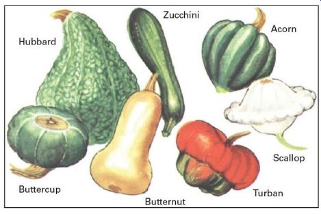 Popular summer squash include zucchini, yellow straightneck, and scallop. Winter squash, which are picked in fall and eaten fully ripe, have hard, thick skins and a rather dry, fibrous flesh, a combination that helps them keep for months. Acorn, buttercup, butternut, hubbard, and turban are standard types of winter squash. Most summer squash are bush varieties; most winter squash grow on sprawling vines. All require a good deal of space, although bush kinds are more compact. Cultural requirements are the same for all types of squash. Squash are frost tender and should not be planted until danger of frost is past and the soil is warm. Where the growing season is short, squash plants should be started indoors. Squash should have a rich, loamy, slightly alkaline soil and plenty of moisture; otherwise the fruits may be undersized. Squash can be planted in hills or in rows. Plant seeds 1-2 in. deep. For hills plant five or six to the hill, thinning later to the two or three strongest seedlings. Hills should be 4-6 ft. apart in each direction for bush squash, 8-10 ft. for vine squash. When row-planting bush varieties, place seeds 24-30 in. apart in rows 36 in. apart; for vine varieties 2-3 ft. apart in rows 9-12 ft. apart. Plant three or four seeds together as insurance against cutworms, slugs, and other garden pests; thin later to the strongest seedling, squash do well with mulch. Summer squash are best picked when they are about 1-2 in. in diameter and while the skin can still be pierced with a fingernail. (Zucchini, however, can be allowed to grow much larger and still be used for baking.) Scallop squash can be picked when 3 or 4 in. across. Cut fruits off with a knife to avoid injuring plants. Days to harvest: 48-55. Keep plants picked for continuous production. Winter squash should be picked in fall when their skin is so hard that it cannot be scratched by a fingernail. Harvest by cutting stems about 3 in. from the fruit. For maximum storage life cure in a warm room for about 10 days, then move to a cool, dry area (avoid freezing). Days to harvest: 80-115.