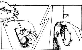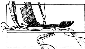 4. Tug the thread into the tension mechanism to be sure it's securely between the discs. (See Hg. 4-9) 5. Position the thread tails directly from the looper and needle eyes out under the back of the presser foot. (See Fig. 4-12) 6. If you’re still having problems, clip the needle thread(s) just above the eye, and turn the handwheel until the loopers are not crossing. (See Fig. 4-11) Hold the threads behind the presser foot and turn the handwheel a few times to confirm that they are properly threaded before rethreading the needle(s). 7. If you still can’t thread the machine properly, get a good night’s sleep and start again when you’re fresh and not frustrated. Completely rethread from scratch, following the sequence recommended in your owner’s manual. TIPS: A common threading problem occurs after you rethread the lower looper. Because you turn the handwheel to position the lower looper to the left for threading visibility and then to the right to thread the eye, it picks up and traps the needle thread(s) as It passes across. When you start to serge, the threads will cross each other and the one with the greatest stress (usually the looper thread) will break. (Fig. 4-15) The easiest solution is to raise the needle to its highest position and pull the needle thread(s) out from the needle plate (using the tweezers) just before beginning to serge. (Fig. 4-16) If you can’t remember to clear the needle thread(s) every time you rethread, clip the needle thread(s) before rethreading.