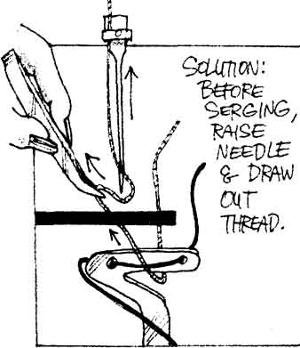 TIP: Slide your tweezers under the foot from front to back to quickly release and straighten all the threads. Threading Troubleshooting If the thread keeps breaking, or stitches are not forming properly, or a thread chain isn't forming at all, chances are the serger is threaded incorrectly—the most common serger problem. The solution is relatively simple: carefully retrace the thread paths, one at a time: 1. Begin tracing each thread at the spool base. Is the thread unwinding smoothly from the cone or spool? Make certain the thread- guide pole is extended to its highest position. And be sure the thread isn't wrapped around the spool pin, caught in a spool notch, or wound under the spool. For even feeding, use spool caps or cone holders. On several models, the spool base must be moved to the right and clicked into position for serging (check your owner’s manual setup procedure). Not moving it over will cause incorrect stitching. 2. Unwind a yard of thread by hand from the cone or spool to see if the thread is unreeling freely and evenly. If it isn’t, check for excess glue from the wrapper or possibly a drop of seam sealant. Unwind and discard the unusable thread. 3. Continue tracing each thread path to be sure every guide has been threaded, including the eye of the looper or needle. Also make certain the thread isn't wrapped around any guides twice or threaded through in the wrong direction. Check that the thread isn't wrapped around the needle. (Fig. 4-14)