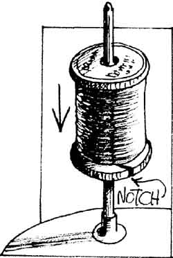Because of its texture, woolly nylon has some stretch and works well on stretch fabrics. It is made of 100% nylon and is exceptionally strong. In addition, its soft finish is very comfortable on seams that will be worn next to the skin. TIPS: One brand of woolly nylon thread (Talon’s Designer Edge) isn't crimped. It can be used for all the same purposes and will still fill in between stitches—it just won’t fluff out quite as much. Synthetic threads may leave a sticky residue between the tension discs, and cotton thread may leave lint fibers. Clean the discs regularly. All-purpose Thread Because of its shorter yardages, all-purpose thread is sometimes less convenient. However, if an exact color match is necessary and you won’t be using that color again, you may find it a better buy than large spools or cones of serger thread. All-purpose thread is heavier in weight than serger thread and is best used on medium- to heavy-weight fabrics. Use extra-fine all-purpose thread for more delicate fabrics. When serging with traditional all-purpose spools, be sure to place the notched side down and use a spool cap for even feeding. (Fig. 4-3) TIPS: Because of its strength, I always recommend all- purpose thread over lighter weight serger thread. Some imported all- purpose thread is cross- wound in a diamond pattern and will release easily from the top of the spool. Look for imported brands of all-purpose thread that come on smooth spools. They won’t catch or require spool caps during serging. Good Quality Versus Poor Quality Beware of bargains when purchasing thread. The money saved isn't worth the frustration of serging with poor-quality thread. Because a serger stitches so quickly—around 1,500 stitches per minute—thread strength and quality are especially important. Inferior thread may have weak spots that break, even twists or slubs that catch in a needle or thread guide, or loose fibers that fray. Look at the thread carefully to judge the quality. Inferior thread, made with short, leftover filaments, may have fiber ends poking out, giving the thread a “hairy” look. Or the thread may be twisted unevenly with thick and thin areas. Quality thread is smooth and evenly twisted. (Fig. 4-4)