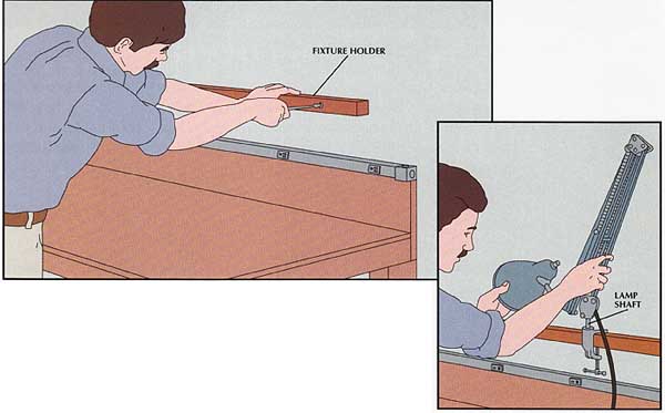 • At the first fixture box, attach a green jumper wire to the grounding screw • Connect the bare wires of the two cables to the green jumper wire and the green wire of the fixture cord with a wire cap. • Connect the white wire of the cable from the power source, the white wire going to the second fixture box, and the white wire from the fixture cord. • Join the black wires of the two cables. • Connect the black wire of the fixture cord to the red wire of the cable going to the second fixture box. 3. Wiring the second fixture box. • Fasten a green jumper wire to the grounding screw in the second fixture box. • With a wire cap connect the bare wires of the two cables to the green jumper, and the green wire of the fixture cord. • Connect the black wire of the cable from the first fixture box to the white wire of the cable going to the switch. • Join the white wire of the cable from the first fixture box to the white wire from the fixture cord. • Connect the red wire of the cable from the first fixture box, the black fixture-cord wire, and the black wire from the cable going to the switch. • Wire the switch (Step 3). SPOTLIGHTING A WORKBENCH • Draw a level screw-hole line on the wall 9 inches above the table. • For a concrete wall, as shown here, drill holes for screw anchors at 1 -foot intervals along the line. Insert the anchors. • Drill corresponding clearance holes along the centerline of a 2-by-2, then secure it with 3-inch No. 8 screws. • Fasten the lamp’s clamp to the 2-by-2, then fit the lamp in place (inset). If there is a stud wall behind the bench, nail the strip to each stud with 3½” common nails. == A Bench Dog for Lamp Support == A workbench with “dog holes” along one edge of the top enables you to fit the holes with metal bench dogs and then clamp a large workpiece between a dog and the vise. You can also use the square dog holes to sup port a lamp. Bore a hole the same diameter as the lamp shaft into the end of a wood block cut to fit the holes. Position the light at any of the holes along the bench. If your bench doesn’t have dog holes you can bore a hole in a hardwood block and clamp it in the bench vise. == Next: BENCHES, JIGS, AND ACCESSORIES: Intro and Building
