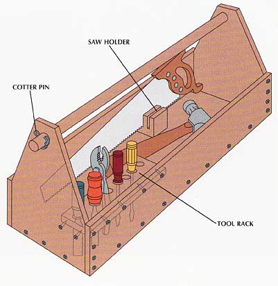 | Certain jobs such as fixing a leaky faucet or patching wallboard cannot be undertaken in the shop. In such cases, you have to take the workshop to the job. Tool and Material Carriers: A wooden toolbox (below) sized to accommodate the items you expect to carry is a worthwhile accessory. Rather than trying to transport all your tools in a single box, you may prefer to build two or more smaller carriers— one for all-purpose tools, another for electrical work, and a third to take to plumbing jobs. A hardware organizer is ideal for carrying small items such as nails, screws, bolts, nuts, and washers. For toting cumbersome materials such as 4-by-8 sheets of plywood or wallboard, build a rope-handled carrier. Workstands: For jobs away from the shop that require a temporary workbench, you can set up and support a work surface with two folding sawhorses. Compact and simple to transport, these stands pass easily through doorways and, when not in use, hang almost flat against the shop wall. TOOLS:
