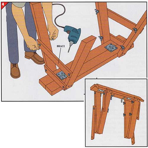 • For each top brace, hold a 1 -by-3 across a pair of legs and butted against the underside of the top, and mark the outside edge of the legs on the 1 -by-3. Mark bottom braces 10 inches lower down the legs. Saw the braces to length. • Tack the upper braces to the legs and drill 3/8-inch clearance holes through the braces and legs. Remove the nails and attach the braces with 5-inch carriage bolts, washers, and wing nuts. • Remove the scrap wood, and secure the lower braces the same way. To fold the sawhorse for transport or storage (inset), remove one bolt from each brace and let the braces hang free; the hinges under the top will let the legs collapse. Store the bolts you removed in the legs. Next: A Bench for