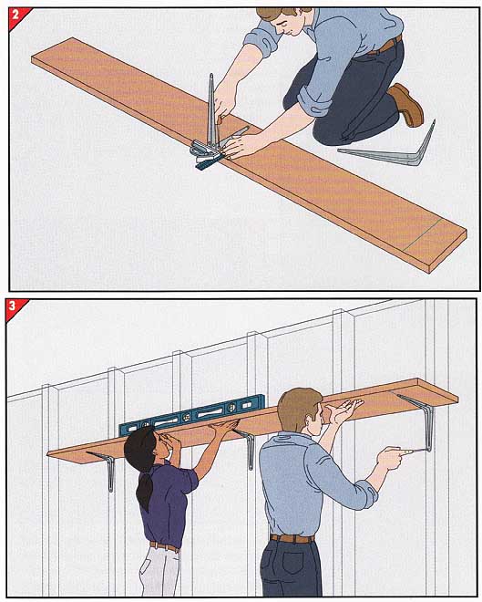 • Center a shelf bracket on one of the marked lines on the shelf, butting it against a combination square to position it flush with the edge of the shelf. • Mark the screw-hole locations on the shelf, drill a pilot hole for 3/4-inch screws at each mark, and fasten the bracket to the shelf. • Attach the remaining bracket in the same way. For the masonry-wall shelf, space the brackets equally along the length of the shelf, then fasten them in place. 3. Fastening the shelf. • Reposition the shelf on the installed bracket. With a helper, level the shelf, then mark the screw-hole locations for each bracket. • Remove the shelf, drill a pilot hole for 1½-inch screws at each mark, then fasten the brackets to the studs. • Screw the first bracket to the underside of the shelf. On the masonry wall, position the shelf on the wall and mark the bracket holes. Drill a pilot hole at each mark, drive in masonry anchors, and secure the brackets. Storage between Wall Studs • Turn off the power to electrical circuits in the work area in case you cut into wires. • With a wallboard saw, cut out a section of wall board to expose the studs behind the wall. Remove any fire stops—boards fastened horizon tally between studs—from the exposed area.1/4-inch hardboard panel to fit each gap between the exposed studs, spread construction adhesive on one side of the panel, and gently press it into place (top). 2. Marking shelf locations. At each position for the first tier of shelves, hold a level across two adjoining studs and mark level lines on their front edges (middle). 3. Mounting the shelves. • Cut two 1 -by-4 supports for each shelf, making them 3/4-inch shorter than the distance from the sole plate to the shelf-location mark. • Cut 1 -by-6 or 1 -by-4 shelves to fit between the studs. • Set the shelf supports on the sole plate, flat against the insides of the studs, and nail them in place with 2-inch common nails. • Lay each shelf on its supports and toenail two nails through each end into the stud. • Mount more tiers of shelves the same way, resting the supports on the first tier. Anchoring Shelves to Joists • For joists perpendicular to the shelves, hang a plumb bob from the outside faces of the joists at each end of the proposed shelf and have a helper mark the floor where the bob touches it. Mea sure the distance between the marks and cut a pressure-treated 2-by-6 3 inches longer than this length. Position the board with each end extending 1½-inches beyond each mark. Holding the baseboard against the wall, shim it level, if necessary, and fasten it to the floor with 3-inch masonry nails. • For the end joists and every second joist in between, cut a 2-by-6 support to span from the baseboard to 6 inches above the bottom edge of the joists. Fasten the top of the supports to the joists with three 3-inch common nails. • Check each support for plumb with a level, then toenail the bottom to the baseboard with 3½-inch nails. For joists running parallel to the shelving, first cut 2-by-6 blocking to fit between the joist resting on the top plate and the next joist at 32-inch intervals. Fasten the blocking to the joists and toenail it to the joist on the top plate with 3½-inch nails. Then prepare the baseboard and supports, anchoring the supports to the blocking rather than the joists (inset).