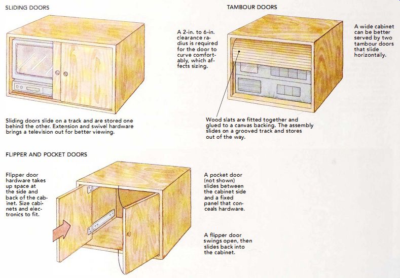 SLIDING DOORS A 2-in. to 6-in. clearance radius is required for the door to curve comfortably, which affects sizing. TAMBOUR DOORS Sliding doors slide on a track and are stored one behind the other. Extension and swivel hardware brings a television out for better viewing. Wood slats are fitted together and glued to a canvas backing. The assembly slides on a grooved track and stores out of the way. FLIPPER AND POCKET DOORS Flipper door hardware takes up space at the side and back of the cabinet. Size cabinets and electronics to fit. A pocket door (not shown) slides between the cabinet side and a fixed panel that conceals hardware. A flipper door swings open, then slides back into the cabinet. A wide cabinet can be better served by two tambour doors that slide horizontally. --------------- Options for Entertainment Center Doors Swinging doors are the standard on cabinets, but there are other types of doors to consider for entertainment centers. Sliding doors have been a rarity since the 1960s, but with modern design back in vogue, we're seeing more of them again. They're ideal for concealing televisions in more traditional-style cabinets, too. Sliding doors require no clearance in front of the cabinet (you won't bang your head on them), but they also don't allow the entire cabinet to be viewed, so television size should be planned accordingly. Flipper and pocket doors swing open just like a swinging door, but then they slide into the cabinet along the sides (overhead flipper doors are available, too). A pocket door slides between the cabinet case and a panel that hides the sliding mechanism and provides a surface for supporting shelves (see the drawing on the facing page). A flipper door slides back and hides the hardware, but it can't support shelves, of course. Ideally, each type of door retracts completely into the cabinet (the handle has to fit inside the cabinet, too) so that the doors don't obscure your view of the television inside. Be aware that flipper and pocket doors require extra depth and width to handle the hardware and the door. The pocket door takes up more space because of the extra side panel. Tambour doors are made up of thin strips of material that slide up and out of the way on a track. They do take up space at the top of the cabinet, both for the door and the curved track, so it's necessary to allow extra clearance when sizing electronic equipment. ----------- Breathing Room While today's electronics don't have vacuum tubes, which were notorious for high temperatures, they still give off heat. If not properly ventilated, the heat can burn out electronic equipment prematurely. A built-in entertainment center should include enough clearance around the television or sound system for heat to dissipate, and a freestanding unit should have space behind it for ventilation. An electronics expert can provide valuable advice for your specific system. -----------