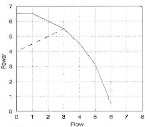 Generated pressure decreases as pump flow increases. On the other hand, absorbed power increases with flow. FIG. 48 shows the characteristics of a pump used as a turbine, i.e. the flow direction and direction of rotation are reversed but the pressure differential is the same. Note that the differential pressure increases as the flow increases. Also that the recovered power increases with flow. However, below a certain flow, the turbine actually absorbs power. FIG. 49 shows the most popular way of connecting a pump and energy recovery turbine. The clutch is optional and its effect is shown by referring to FIG. 48 and 50.