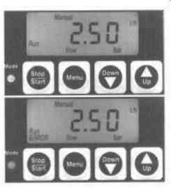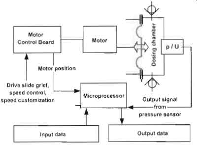 FIG. 69 shows two further frequently occurring faults in the dosing process through comparison with the error-free pressure profile (curve 1). If leakage occurs in the suction valve (curve 2), pressure builds up more slowly due to the leakage in the suction valve and the pressure falls before the outer dead center is reached as soon as the leakage rate is larger than the current flow rate of the pump. Should leakage occur in the discharge valve (curve 3 in FIG. 69), a rise in pressure occurs before the end of the suction stroke when the leakage rate in the discharge valve is larger than the current suction flow of the pump. Moreover, the pressure falls more slowly at the start of the suction stroke as a result of post-flow in the discharge valve. This indicator diagram is also suitable for detecting other faults; for example, if the set system pressure is exceeded. This can be identified and evaluated. System solution The dosing pump also incorporates a pressure sensor. This enables the existing microprocessor to be used for both motor control and processing the measurement values. As can be seen from FIG. 70, the microprocessor continuously records the pressure in the dosing chamber and, using the motor control, the motor position which can also be used to determine the diaphragm position on the basis of the drive kinematics. This means that the microprocessor can generate the indicator diagram on a continuous basis. Evaluation algorithms have been developed to enable detection and evaluation of the dosing errors. By setting the basic monitoring parameters for volumetric flow to cover a wide range of standard applications, depending on the error in question, a fall in the dosing rate of only 30% can be detected. It is also possible to use the indicator diagram's memory of representative points and use them for the purpose of diagnosing errors. See FIG. 71. The processor also takes an average of the values to continuously calculate the feed pressure in the dosing chamber. This value is representative of the current system pressure and can be queried at any time. Summary Continuous monitoring of diaphragm dosing pumps by recording and automatically evaluating the current indicator diagrams opens up many opportunities for operational monitoring: The current system pressure parameter enables a process to be established which is largely independent of the pump size. The indicator diagram is largely independent of speed, viscosity and temperature. This establishes the same system for detecting errors across the pump's entire volumetric flow range without defining a working point. Recording the current system pressure enables users to balance out pressure-dependent fluctuations in the flow rate of the pump by adapting the speed. 23. Positive displacement medium pressure pump system for tube press application Introduction The removal of waste iron ore from the furnace exhaust along with other waste products is an important stage in tube press processing of waste products at any steelworks. The ore is then re-processed into briquettes for re-cycling. The ore is transported via water which becomes a slurry. The key factor in this process is to extract the ore using the application of high pressure water to squeeze the slurry through a filter press. See FIG. 72.