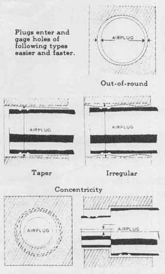 Air gages have several advantages. The gage head does not touch the workpiece. Consequently there is no wear on the gage head and no damage to the finish of the workpiece. Variations in workpiece geometry that would be difficult to measure by mechanical means can be detected by air gaging ( FIG. C-18).