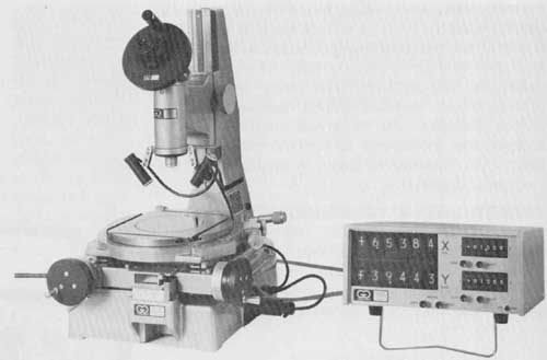 ELECTRONIC COMPARATORS -- Electronic comparators ( FIG. C-39) take advantage of the sensitivity of electronic equipment. They are used to make comparison measurements of parts and other measuring tools. For example, gage blocks may be calibrated using a suitable ironic comparator. MEASUREMENT WITH LIGHT TOOLMAKER’S MICROSCOPE -- The tool maker’s microscope (FIG. C-40) is used to inspect parts, cutting tools, and measuring tools. The microscope has a stage that can be precisely rotated and moved in two perpendicular axes. The instrument may be equipped with an electronic accessory measuring system that discriminates to .000 1 in. Thus stage movement can be recorded permitting measurements of a work- piece to be made.