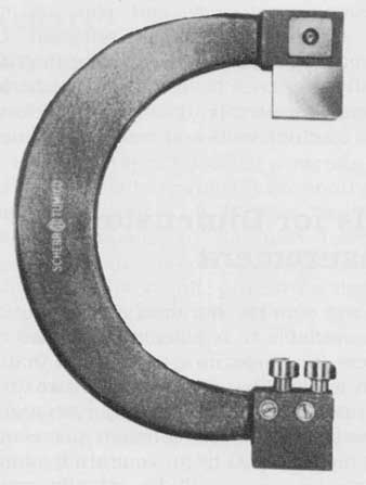 DIAL INDICATING SCREW THREAD SNAP GAGE -- The dial indicating screw thread snap gage ( FIG. C-27) is used to measure an external thread. The instrument may be fitted with suitable anvils for measuring the major, minor, or pitch diameter of screw threads. Discrimination is .0005 or .00005 in., depending on the dial indicator used.