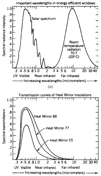Three air spaces are thus created and filled with a nonreactive gas mixture to retard convection. Nonmetallic spacers reduce heat flow at window edges. The resulting window provided a center-of-glass insulating value of R-8.1 (SI: R-1.43). (ASHRAE lists for a similar window, non-operable, 4 ft (1220 mm) square, an overall window U = 0.19.) Very low transmission of UV radiation is another characteristic.