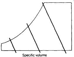 The next addition shows how the density of air varies as its temperature and moisture content vary. These lines are those of specific volume, the reciprocal of density, a useful quantity in air-conditioning calculations and helpful in understanding the stack effect (Section 14b). The specific volume is given in ft^3/lb (m^3/kg) of dry air. From these lines in FIG. 38 it can be seen that a pound of hot air is larger (has more volume) than a pound of cold air. This larger volume per unit of weight increases buoyancy; thus, hot air rises, whereas cold air sinks. The next addition (FIG. 39) involves enthalpy, the sum of the sensible and latent heat content of an air-moisture mixture relative to the sum of the sensible and latent heat in air at 0ºF (0ºC in SI units) at standard atmospheric pressure. Enthalpy units are Btu/lb (kJ/kg) of dry air. Enthalpy lines are almost parallel to those of WB temperature. Per haps the most familiar process to travel along the lines of constant enthalpy is evaporative cooling, where increased moisture and lower air DB temperature are obtained without changing the enthalpy (total heat content) of the air. There is indeed a drop in sensible heat as the temperature drops, but this is matched by an increase in latent heat as the moisture content increases. The opposite pro cess is chemical (desiccant) dehumidifying, where decreased moisture content is obtained at the price of increased air DB temperature; again, no change in enthalpy (total heat) occurs.
