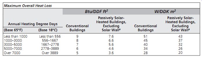 For infiltration, determine the number of air changes per hour (ACH) under winter design conditions and multiply this infiltration (or fresh air) rate little benefit in pouring solar heat into a leaky building. For solar designers, the motto should be "Insulate before you insolate." (a) Whole-Building Heat Loss Criteria The recommended maximum rates of heat loss (in Btu per degree days [DD] per square foot) shown in TABLE 3 are the basis for development of the following passive solar heating guidelines. They are also useful as a quick check on overall envelope performance in residential or small commercial buildings. (Some states have adopted similar criteria as part of their building codes; be sure to check the applicable code before relying on these numbers for code compliance.) The heat loss rates are shown for two conditions: 1. Conventional (non-passively solar-heated) small buildings. The overall rate of Btu/DD ft^2 is based on total heat loss, including all portions of by a constant that accounts for density and specific heat: or ACH (volume, m ) 0.33 = ACH (volume, ft ) 0.018 = 3 3 UA for infiltration Add the envelope UA values to those for infiltration, multiply by 24 h/day to account for DD, and divide by the building's total heated floor area: (+ )24h totalh envelope infiltration UA UA × heated floor area(ft ) =Btu/DDft^2 2 2. Passively solar-heated buildings. Here the overall rate of Btu/DD ft 2 excludes the solar collecting portion(s) of the envelope; otherwise, it is based on total heat loss from all other portion(s) of the envelope, and it includes infiltration. The equation used to determine the overall solar building rate is as follows: ( envelope, except south glass infiltr UA UA + a ation 2 ) 24h total heated floor area(ft ) × = Btu/DD ft^2 One of the biggest unknowns in this procedure is the assumed rate of infiltration. A care fully designed and constructed small building can easily achieve a rate of 0.75 ACH; with increased attention to air barrier installation, caulking of all cracks, and so on, rates below 0.33 ACH have been demonstrated. Passive solar heating and energy conservation have a complex relationship. Relative to conventional buildings, passively solar-heated buildings usually conserve purchased energy; yet, buildings that aim at very high percentages of solar heating can use more total heating energy than is used by buildings with smaller window areas. Designers interested primarily in saving purchased energy may aim at lower solar percentages and more insulation; designers interested in buildings that closely relate to climate and climatic changes may aim at higher solar percentages (and more daylighting), along with higher thermal masses and, probably, greater ranges of indoor temperature. (b) Solar Savings Fraction (SSF) The term solar savings fraction is used to express a building's solar heating performance. The SSF is the extent to which a solar design reduces a building's auxiliary heat requirement relative to a "reference" building-one that has, instead of a solar wall, an energy-neutral wall that experiences neither solar gain nor heat loss; otherwise, the solar building and the reference building are identical. The SSF compares the auxiliary energy needed by the solar building to the auxiliary energy needed by the reference building, as illustrated in FIG. 7. Remember that the SSF is not the percentage of the solar building's heat supplied by the sun; typically, the sun provides a much higher fraction of a building's total space heat than suggested by the SSF. Rather, the SSF is more a measure of the solar building's conservation advantage.