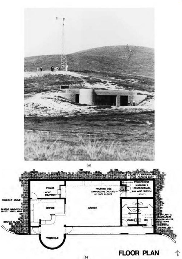 (h) Passive Cooling Summary As a summary example of a passively cooled and solar-heated building, consider the Visitor Center for the Antelope Valley California Poppy Reserve, about 85 miles northeast of Los Angeles (FIG. 57). Set in a high desert where winter temperatures sometimes fall below 20ºF, the building is 100% passively solar heated by a combination of direct-gain and Trombe wall strategies, interior thermal shades, and thermally massive ceiling, walls, and floor. An earth sheltered, thermally massive building was chosen for its suitability to the environmentally sensitive site, as well as for its year-round thermal advantage in a desert climate. On summer days when air temperatures frequently exceed 100ºF, a combination of an earth tube and evaporative cooling provides a modest supply of fresh air without overheating. Continuous power ventilating of the building at night draws the cool outdoor air through the tube, then over the thermally massive surfaces to provide added cooling capacity for the following day. The 2100-ft^2 building also is served by an 8-kW wind generator and has its own well. 15. CASE STUDY-DESIGNING FOR HEATING AND COOLING Blue Ridge Parkway Destination Center, Asheville, North Carolina