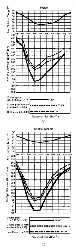 To obtain the DD balance point needed to estimate a particular building's heating needs, interpolate between the various base DDs as required. (If the balance point is below 50ºF, get lower DD base figures from your local weather station. Do not extrapolate!) (c) Yearly Space-Heating Energy To estimate the heating energy needed over an average year for a building, E, calculate [...] where E is in units of fuel consumed per year (therms of gas or kWh of electricity) UA is the total heat loss rate, envelope + infiltration (Btu/h ºF, or W/ºC) DD balance point is obtained as just described AFUE is the annual fuel utilization efficiency, displayed on all furnaces manufactured within the United States (TABLE 7) V is the heating value of the fuel from TABLE 5 10. PASSIVE SOLAR HEATING PERFORMANCE Section 4 presents design guidelines for determining solar opening size, thermal mass, and the solar savings fraction (SSF). As a building design takes shape, more detailed information becomes useful: Which passive system matches the architectural program? Which performs better thermally? For a given solar opening, what exactly is the resulting SSF? How much auxiliary fuel consumption per year must accompany that SSF? If a building over heats on sunny winter days, how hot will it get? To this point, passive solar heating has been treated as a single approach; the design guidelines for SSF distinguished only between standard and superior system performance. Important architectural differences, however, characterize the various passive solar heating approaches, as summarized in TABLE 8. On the basis of the wider architectural implications presented in TABLE 8 and the detailed sizing information found in Section H, the designer can select a passive solar heating approach with some confidence in its applicability and its yearly need for auxiliary space heating. (a) Glazing Performance In the reference systems of Table H.1, the glazing is assumed to face due south. The choices of glazing conditions include single, double, and triple glazing, and night insulation "no" or "yes." Single, double, and triple glazing with no night insulation are common approaches. Movable night insulation, once common (FIG. 25), has largely been sup planted by superwindows. Yet, which of the current superwindows might provide a performance approximately equivalent to double glazing with R-9 night insulation? The 24-hour averaged U-factor of the double glazed fixed window with R-9 night insulation is found as follows: a double-glazed window, with a wood/vinyl frame, corresponds to window #5 in Table E.15, with a U = 0.49. "Night insulation" assumes adding R-9 insulation, in place from 5:30 P.M. to 7:30 A.M. This extra-insulated window should at night then have an overall R of at least (1/0.49) + 9 = R-11; then nighttime U = 1/11 = 0.09. U24av = (14 h)(0.09)] [(10 h)(.49) 24 h ? = 0 0.257 The equivalent superwindow would then have these characteristics, based on window #5's solar gain: U = 0.26, SHGC = 0.58, VT = 0.57 Such a combination may be difficult to obtain. Here are some choices for superwindow substitutes for the "double/yes n.i." option within the Section H reference types: • Where listed, choose the triple-glazing option instead of the double/yes n.i. • Use window #7, Table E.15, with U = 0.33, SHGC = 0.55, VT = 0.52, with nearly identical solar gain characteristics, and interpolate between double/yes n.i. and double/no n.i. on the basis of U-factors: Double/no n.i., U = 0.49 Double/yes n.i., U = 0.26 Window #7, U = 0.33 This places window #7 at about one-third of the difference, closer to double/yes n.i. • Use the clear triple-glazed window (#12, Table E.15) in place of double/yes n.i., and given its U = 0.34, SHGC = 0.52, VT = 0.53, interpolate for U-factor as with window #7.