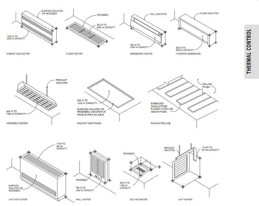 (b) Electric Resistance Heaters These common devices carry the disadvantage of using high-grade energy to do a low-grade task, as shown in Fig. 2.6. Their advantages, however, are impressive: low first cost and individual thermostatic control that can easily be used to make each room a separate heating zone. Thus, the energy wasted at the electricity-generating plant (usually 60% to 70%) can be partially "recovered" at the building, where unused rooms can remain unheated. A few of the many types of electric resistance heaters are shown in FIG. 15. As in the case of metal wood stoves, surfaces can sometimes reach high temperatures, requiring care in the location of heaters relative to furniture placement, draperies, and traffic flow. Electric heaters are sized by their capacity in kilowatts (1 kW = 3413 Btu/h). The maximum watt density allowed is 250 W per linear foot of heater (820 W per linear meter).