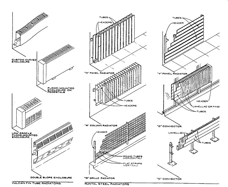 Baseboard convector selection is then made from the manufacturer's data tables, such as the one shown in TABLE 3. The two common baseboard types are RC, usually cast iron with a water-backed front surface and an extended rear heating surface, and finned tube, a metal tube with an extended surface in the form of fins, usually placed behind a metal enclosure.