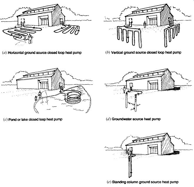 Room air is taken in as shown, then discharged (after cooling or heating) upward across the glass surface-the likely point of maxi mum heat loss or gain. The horizontal ground source closed loop heat pump (FIG. 44a) requires trenches 3 to 6 ft (1 to 2 m) deep; typically, 400 to 650 ft (120 to 200 m) of pipe are installed per ton (12,000 Btu/h or 3.5 kW) of heating and cooling capacity. To squeeze more pipe length into a trench, a "slinky" coiled pipe is sometimes used. The trenches can be placed below parking lots or lawns and gardens. The vertical ground source closed loop heat pump (FIG. 44b) is particularly applicable where the site area is limited. Vertical holes are bored from 150 to 450 ft (46 to 137 m) deep. Each hole contains a single full-depth loop and is backfilled (or grouted) after the loop is installed. Because the summer temperature is much lower at greater depths, less pipe length is required than for horizontal loops. The distance between boreholes varies from a mini mum of 15 ft (4.6 m) with high water table and low building cooling loads to as much as 25 ft (7.6 m) for buildings with high cooling loads. A minimum distance of 20 ft (6 m) is usually recommended. The pond or lake closed loop heat pump (FIG. 44c) is sometimes used when a building is close to an adequately large body of water. The loop is submerged, and the surrounding water conducts heat far more rapidly than does soil. The resulting shorter length required, and the low cost of placing the coils in water, can make this attractive. How ever, the water level in the pond should never drop below a minimum of 8 ft (2.5 m) and must have sufficient surface area for heat exchange.