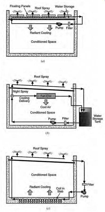 (d) Evaporative Cooling: Roof Spray In the past, when roofs were poorly insulated, roof sprays were rather common ways to reduce heat gains. New variations promise new energy savings. Roof color is the first consideration; white or near-white roofs are the first step toward energy savings through control of sol-air temperature. However, emissivity is also involved; the higher the emissivity, the faster a roof surface reradiates its heat to the sky. TABLE 1 compares the solar absorptance, albedo (overall solar reflectance), and emittance of some common roofing materials. The combination of high albedo and high emittance resists solar heat gain most effectively. (It also promises to reduce the heat island effect in urban areas; see Section 3.) A solar reflectance index (SRI) was developed to allow quick comparisons between roofing products. The SRI scale ranges from 0 (approximately the combination of 5% albedo and 90% emittance; roughly equal to black asphalt shingles) to 100 at 80% albedo and 90% emittance (roughly equal to T-EPDM). The night roof spray thermal storage system (NRSTS) cools water on a roof by night, using both night sky radiation and evaporation. The water is then stored for use the next day in building cooling. The water can be stored either on the roof (below floating insulation, above a structural ceiling) or in a tank below the roof. When stored on the roof, it becomes a variant of the roof pond cooling system. When stored in a tank, the water can be circulated through a cooling coil to pre-cool air before it enters the chiller-fed cooling coils. It is thus used to assist mechanical cooling. Three variations are shown in FIG. 7. At a Nogales, Arizona, border patrol station, a 6500-ft 2 (604-m^2) flat white roof was retrofitted with an NRSTS, utilizing a 10,000-gal (37,850-L) above-ground tank. Over the summer of 1997, it averaged 250 Btu/ft^2 day of cooling. Water use at various sites has averaged 4 to 5 gal/h (15 to 19 L/h) per 1000 ft^2 (per 93 m^2) of roof area. Details are presented in Bourne and Hoeschele (1998). (e) Evaporative Coolers These are also affectionately termed swamp coolers and desert coolers and are familiar devices in hot, arid climates (FIG. 8). (They are used in other climates for special high-heat applications such as restaurant kitchens.) They require a small amount of electricity to run a fan and some water to increase the RH of the air they supply to the building. This process of cooling is explained in Section 8.14. The typical evaporative cooler (shown in FIG. 8) needs full access to outdoor air and is thus often set on the roof; through-the-wall units are also available. Great quantities of dry, hot outdoor air are blown through pads kept moist by recirculated and makeup water. The "cooled" air is then delivered to the indoor space. The effect of the gently moving cool air is to cool the body and to produce further cooling by evaporation of body moisture. Air introduced into the indoor space must then be exhausted for the system to operate properly. By selecting the room through which the air is exhausted, one can route cool air as desired in any chosen path from unit to relief opening. The closer to the relief opening, the warmer the indoor air.