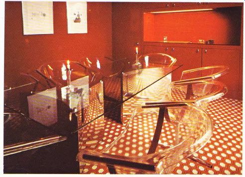 [...] equipment does not clutter the room with extra furniture. The outside perimeter of the room is covered with brindle-colored quarry tiles. At the end of the room, in two arched recesses, are large fitted mahogany bookshelves with cupboards below. The arch on the left side is a concealed door. The whole unit can be swung open easily and it leads into the exciting garden room. The reason for a concealed door-besides being a good topic for conversation!-is that it makes the garden room into a private, quiet place. It also means the room can be effectively shut off in cold weather. The huge door is built on the same principle as a bank safe door. Being heavy, it is supported on three stainless steel strap hinges. The leading edge of the door is on a roller which runs on a stainless steel track. The garden room is a kaleidoscope of color with cheerful zig-zag stripes painted along two walls The louvered doors conceal fitted cup boards on one side and a Beekay mini-kitchen on the other. The kitchen is equipped with a small sink, fridge and boiling ring, making an ideal place for serving drinks, brewing coffee or heating snacks. One remaining wall has glass windows, and the other is covered with mirrors. At night, kinetic lights reflect off the white ceiling. In contrast to the striking appearance ol the garden room, is the open plan kitchen-cum dayroom. The large stainless steel bar, echoed by the roomy bottle rack above, divides the cooking area from the eating and sitting area. A number of useful items have been built into the stainless steel counter top-two bowls for washing up, a circular pastry slab of marble, and an electric cooking hob. The raised oven and fridge have been fitted into a storage wall filled with cupboards and drawers, finished with a red laminated surface.