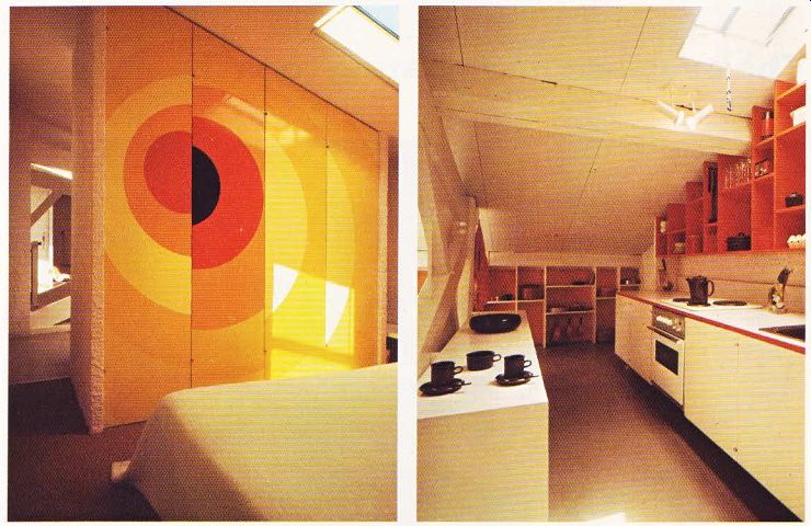 brown floor. All the furniture has been adapted to complement the original structure: it is unobtrusive and functional, and made to measure to save space. Plain mattresses cut from 10in. thick foam and covered in dark brown fabric are arranged round the edge of the living area, with bright scatter cushions on them. The simple coffee tables are plain white painted cubes. A practical and attractive feature of the flat is a long bookcase fitted along one wall, which conceals the roof slope on one side of the living area, and continues past the dining area and into the kitchen, where it forms a useful shelf unit. The compact dining area was also made to measure, with furniture reduced to its simplest form. White-painted cube seats with dark brown cushions stand at a table consisting of a white laminate top on a simple base. Panels of insulation board fixed to the beams that act as a room divider separate this area visually from the kitchen; openings are left in it for use as serving hatches to the dining area. Enormous black lettering livens up the otherwise dull radiator. The main living spaces are divided by natural open partitions formed by the criss-cross roof beams. White laminate units along one wall in the kitchen house basic equipment such as a stain less steel sink, electric hobs and a small refrigerator. A red-painted wall unit of uneven pigeon holes climbs right up to the ceiling and is tailored to the slope of the roof; it provides visible and accessible storage for everything arranged on its shelves. A white laminate worktop similar to the dining table has been fixed to the partition between the two rooms, where it is easily accessible through the openings in the room divider. The wildest splashes of color appear in the bedroom, where a geometric design in red, orange and yellow has been painted on the wardrobe doors. It comes alive when the doors are opened, revealing a vast storage space behind. A low white-painted shelf runs the whole length of the wall behind the bed, and continues into the bathroom, where flexible spotlights pick out the pure white of the walls and fittings. |