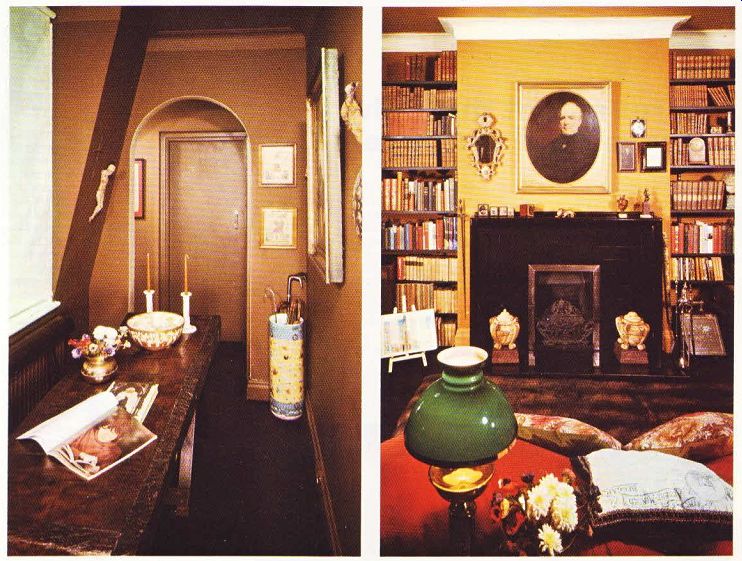 A solid wooden butcher's block, which Vanessa Clyde restored, stained and sealed, now stands on two trestles and acts as a hand some hall table. The dark brown carpet carries on throughout the living and circulation areas; this is most important in a small flat, as then all the areas are linked and the total space appears larger. The 17ft square living room is entirely yellow ochre, which is a good background color for the furniture and paintings. There is ochre felt on the walls and matching paint on the ceiling. Again, the skirting board has been 'painted out' in the predominant color, but here the cornice has been picked out in white to make the room seem taller. Even the radiators are painted ochre, so as to camouflage them. The pale blue tiled fireplace was given a coat of diluted pva adhesive to form a key. then painted matt black; the gas fire was removed and replaced by an open grate. Most of Jeremy Clyde's books are housed in black-painted shelves fitted in the alcoves on each side of the chimney breast. An open book case built from industrial metal shelving bolted together and painted black holds the rest of his books; this has a lighter appearance than a fitted wooden unit. There was not enough room for a conventional sofa and easy chairs, and so two enormous red floor cushions provide the main seating accommodation. They back up against a pair of library steps, on which two converted brass oil lamps stand. Their jade green glass shades combine with the red cushion covers to relieve the predominantly brown color scheme. When the lamps are lit in the evening, with a log fire in the grates a distinctly Victorian atmosphere prevails. Spotlights fixed to the ceiling and walls and directed on to particular paintings and pieces of furniture supplement these table lamps. The small bedroom was painted terracotta, and became a studio where Jeremy Clyde could work in peace. The larger room at the back was fitted out as the main bedroom, with a straw color scheme.