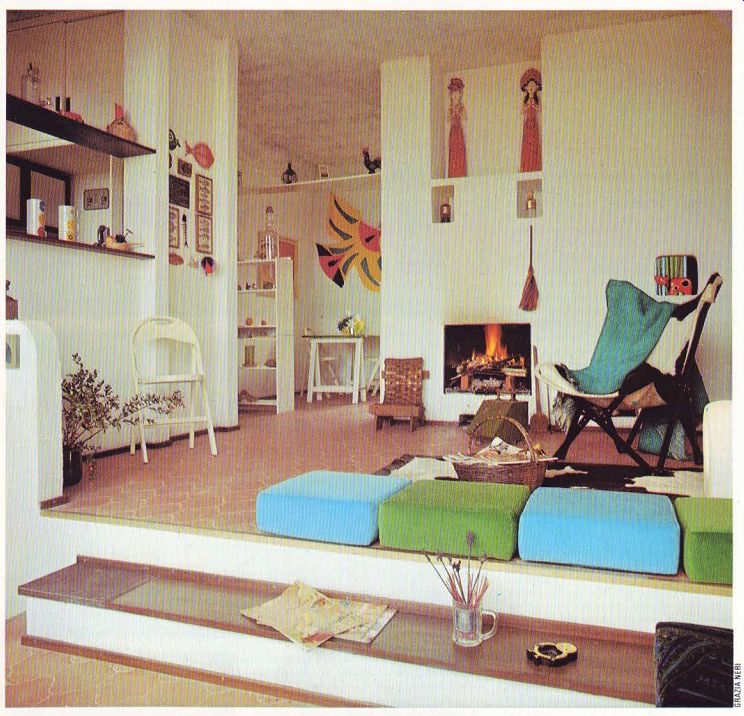 Open-plan living is ideal for some people. It means ease of movement, convenience, and greater spaciousness because of fewer walls and doors. This Italian apartment is based on an open plan scheme, and its colorful decor is designed to complement this type of modern living. Certain ingredients are necessary for successful open-planning. A co-ordinating element such as color or texture-is needed to unify the various areas. Effective techniques for dividing one living area from another are also required. And, finally, a great deal of forethought is a must in planning the layout to facilitate practical and fluid movement in the home. This streamlined flat is basically built on an open-plan scheme; the bedroom and bathroom being the only rooms which are partitioned off. The front door leads into a small entrance hall which opens out into the main living area. There are two sections to the lounging „ area-the ‘sunken' part, spruced up with brilliant colors, and the ‘fireside' part which suggests warmth and casualness. Beyond this is the dining area, originally a second bedroom, which leads into a small, but efficient, kitchen. The flat is designed for comfortable living. There are no long journeys between the kitchen and dining room. If you ‘re relaxing in one of the chairs or couches, you can easily keep track of anything brewing on the stove. It ‘s compact living which still allows for a maximum amount of movement. It's also tailored for easy cleaning. No laborious bouts with the vacuum; the elegant, red tiled floor simply needs a wipe down, and no old fashioned skirting boards or picture railings to collect dust. The absence of lampshades and curtains also eliminates the need for a tedious annual cleaning. If you‘re looking for ways to cut down on housework, this flat has some good […] ------------------143 non Moving up from the sunken area is the fireside section, smartened up with black and white fur skins found in the rug and modern slung chair. A strip around the fireplace, like one of the walls, is roughly rendered plaster-a small but effective touch in that it creates different wall textures and saves the room from a sterile white-wall look so commonly seen in modern buildings. The niches over the fireplace add delightful variety and again help to break up what would otherwise be a featureless expanse of white wall. The low white floor light was an appropriate selection for the modern decor, and the slung chair adds to the feeling of coziness. The bedroom offers another splash of color, mainly seen in the striped cotton chenille bed spread and simple window curtains. Rather than having a conventional bedhead, space was saved by putting a wooden figure directly on the ...