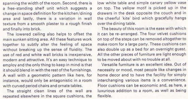 ... wall. It was a good choice in that it has a dream like quality and also picks up the colors already decorating the room. A built-in wardrobe with sliding doors runs along one wall. Inside there is a colorful chest of drawers which is neatly hidden from sight when the doors are pulled shut. Another space saving idea was to take the same material as the curtains and make wall ' pockets' for storing items like newspapers and hair brushes. It's worth taking note of the superb method of making ‘extra' room for storage, as seen in the high long shelf over the bed here and in the main room. The shelf is sufficiently near to the ceiling not to distract from the central design of the room. It ‘s ideal for displays, books or stereo speakers and could also be made a focal point by featuring hanging plants-if you have the time and patience to attend to plants at such a height! Moving finally into the bathroom, there is a repeat of the blue/green motif with a rich tone of gold which adds warmth. The single spotlight on the wall is useful for close work like shaving or putting on make-up. If softer lighting is desired, the spot can be adjusted to reflect off the walls or ceiling. The decor in this flat was not particularly expensive, but through careful planning and expertise in selecting compatible colors and furnishings, it has emerged as a comfortable home with a great deal of visual appeal. |